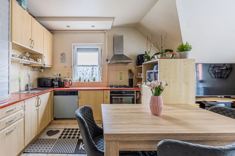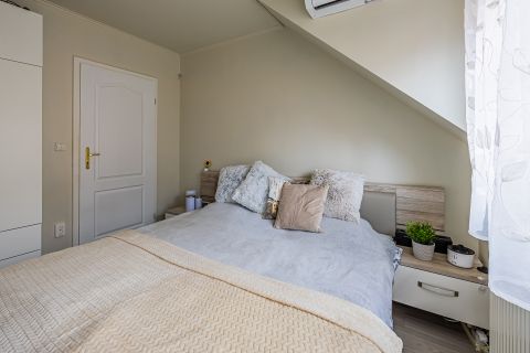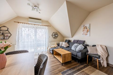 A lakás RÉSZBEN TETŐTÉRI, az egyik hálószoba oldalfala és a nappalinak a sarka csapott, így a nettó 63 nm bruttóban 68 nm-t tesz ki.