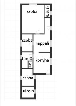 Helyiségek: 2 szoba, nappali, konyha, gardrób, előszoba, fürdőszoba, külön WC, valamint külön bejárattal egy szoba saját WC-vel + tároló.