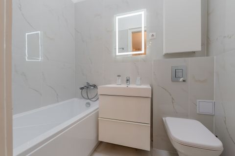 Modern kényelem: Egyedi tervezésű fürdőszoba LED hangulatvilágítással, klíma a nyári hőség ellen, és praktikus amerikai konyha a baráti vacsorákhoz.