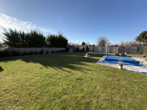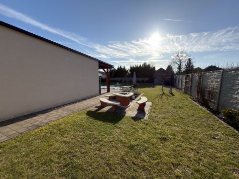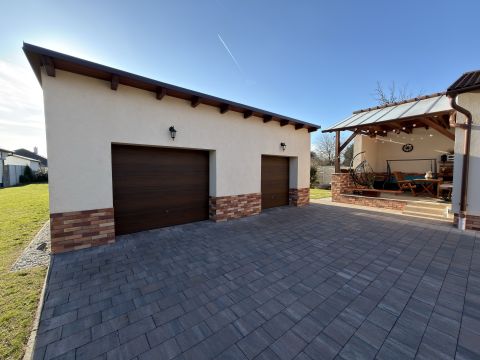 Az 1045 m²-es, sík fekvésű, parkosított telek rendezett és gondozott. Az udvaron egy dupla, szerelőaknás garázs található, amely akár vállalkozási célra is kiváló lehetőséget biztosít, továbbá egy kerti tároló is helyet kapott.