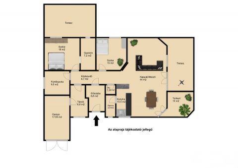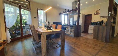 A belső terek világosak, jól élhetők, a nappali, étkező és télikert kellemes, egybefüggő életteret alkot. A házhoz két nagyméretű terasz kapcsolódik (50 m² és 30 m²), amelyek kiváló helyszínt biztosítanak pihenéshez vagy vendéglátáshoz.