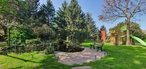 -A telek első, mintegy 3000 m²-es része parkosított, ősfás, gondosan karbantartott. Itt található: