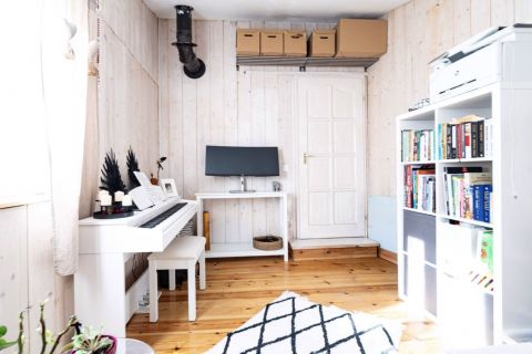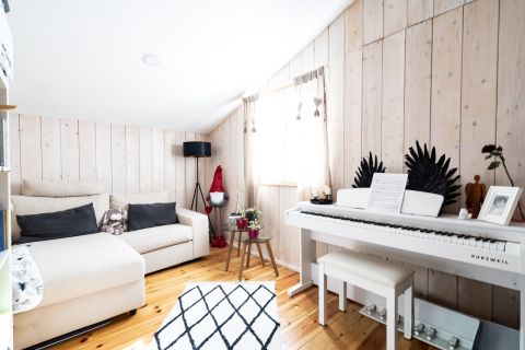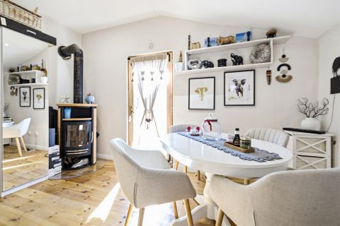 A helyiségek világosak és hangulatosak. A lakótérben fenyő hajópadló, a fürdőszobában járólap található. A természetes fa burkolatok egyedi hangulatot adnak a ház belső tereinek.