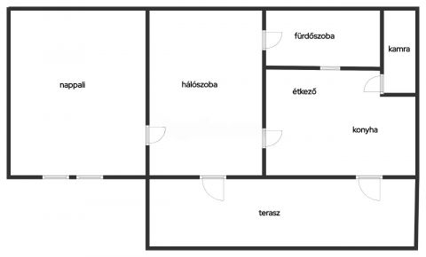 A lakás 53 nm-es 2 szobás, külön konyhás ebédlővel, kamrával, terasszal rendelkezik. Maga a ház szigetelt, a napelemre is elő van készítve. Ablakai, terasz ajtója mind műanyagok, kétrétegű üveggel és redőnnyel felszereltek.
