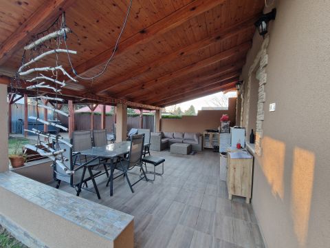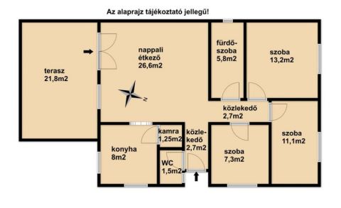 - A 80m2 lakóterű ház helyiségei: nappali-étkező, 3 hálószoba, konyha, kamra, előszoba, közlekedő, fürdőszoba, külön WC, terasz.