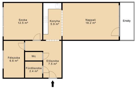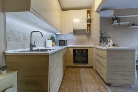Székesfehérváron, a József Attila utca belváros felöli részén található praktikusan átalakított lakás eredetileg a klasszikus 2 szoba hallos volt. A tulajdonos a konyhát a hall részbe költöztette, így a nappalival egy légtérbe került. A kiürített helyiségből egy félszoba lett kialakítva.