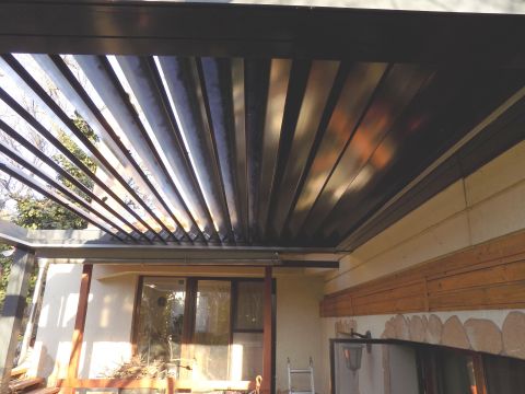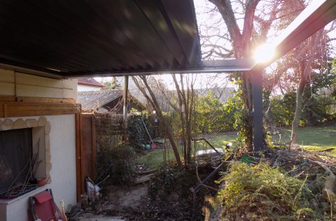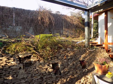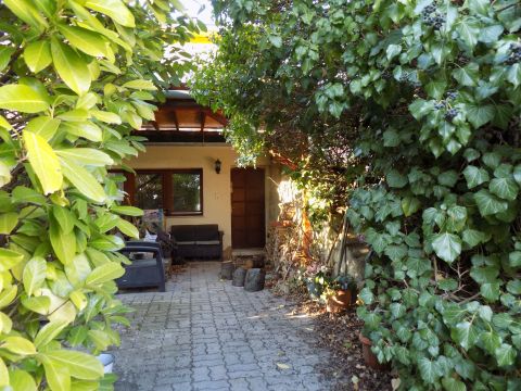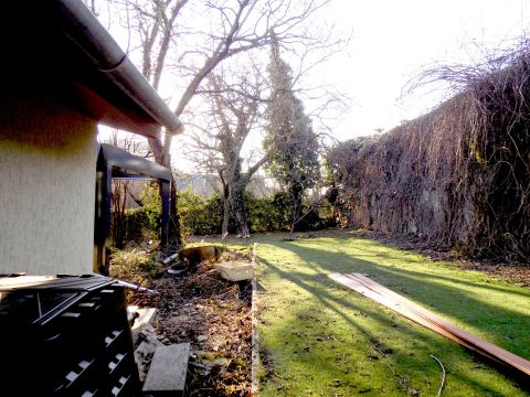 A telek felső felén, az épület felett, kellemes kikapcsolódást ígérő fák által árnyas kert és (a pergolás) terasz.