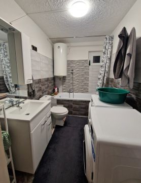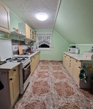 Eladó Erdőkertesen a Géza utcában egy 176 nm-es (nettó), 7 szobás, két generáció számára kialakított, földszinti, és zárt lépcsőházból nyíló emeleti lakásból álló átlagos állapotú családi ház. A földszint, mely a 80-as évek közepén készült el, előszobából, három szobából, fürdőszobából, konyha-étkezőből áll. E szinten a fűtést két darab parapet cirkó biztosítja, új radiátorokkal ellátott központi fűtésen keresztül, a külső nyílászárókat a pár éve műanyagra cserélték ahogyan a burkolatok egy részét is megújították. A tárolóként is funkcionáló lépcsőházból az emeleti szintre jutunk, mely 2012-ben épült, és egy előszobát, fürdőszobát, konyha-étkezőt, valamint három szobát tartalmaz. A fűtést itt gáz-konvektorok biztosítják, a külső nyílászárók pedig műanyagok. A ház 30-as téglából épült, stabil alapokon nyugszik, szigetelve nincs, a tető jó állapotú, födém szerkezete vasbeton, és egy 15 nm-es pincével is rendelkezik. A csaknem 1100 nm-es telken fedett és nyitott kocsibeállót, valamint ásott kutat egyaránt találunk.