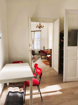 Egy díszes, eklektikus társasház első emeletén található ez a délnyugati fekvésű, világos, összkomfortos, nagypolgári lakás. A három szoba teljesen külön nyílik egymástól egy közös hallból történő megközelítéssel. A fütés egyedi, kombigázcirkó-kazán által biztosított. Az energiafogyasztás külön víz-, gáz- és villanyórával mérhető. 2023-ban villanyóracsere történt. A nappaliba egy fűtő-hűtő klíma is felszerelésre került. A kádas fürdőszoba lichthofra szellőzik. Minden szoba és a folyosó frissen rakott lamináltpadlós; a konyha, fürdőszoba-wc járólappal burkoltak. A külső-belső nyílászárók karbantartottak, frissen festettek. A nappali külső homlokzati nyílászárói új redőnnyel felszereltek. Az ingatlan per-, teher- és igénymentes, azonnal birtokba vehető és költözhető.