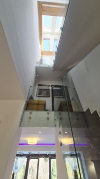 A felsőbb szinteken több kertre néző hálószoba, több fürdőszoba, gardróbok és erkélyek biztosítják a család minden tagja számára a kényelmes életteret.