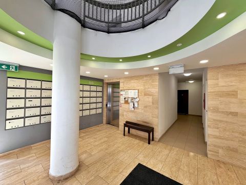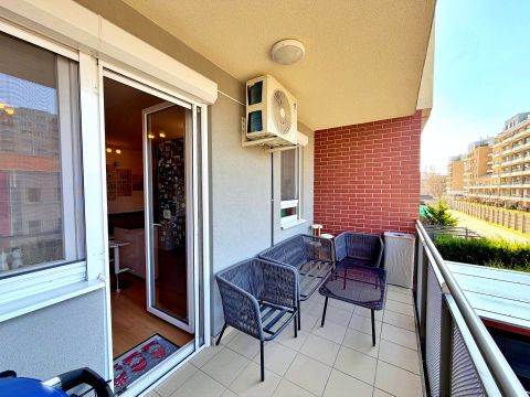 Az erkély kellemes lehetőséget biztosít reggeli kávézáshoz, miközben a lakópark nyugodt, zöld környezete biztosítja a pihenést a város közelségében.
