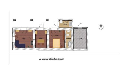 A ház helyiségei: 2 szoba, konyha, étkező, fürdőszoba, tároló, kazánház