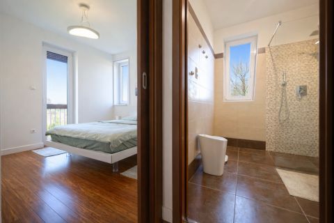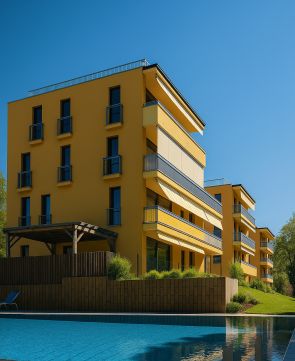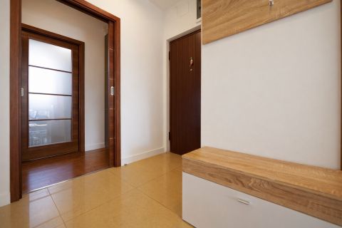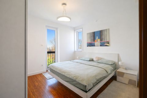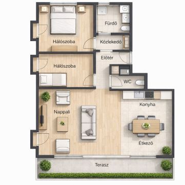A 75 m²-es, első emeleti lakás egyik legnagyobb értéke a teljes üvegfalas nappali, amely a 10 m²-es teraszra nyílik, így az otthon egész nap természetes fényben úszik. A lakás csendes, zöld kertre néz.