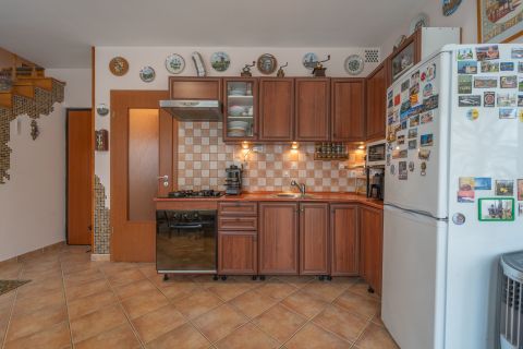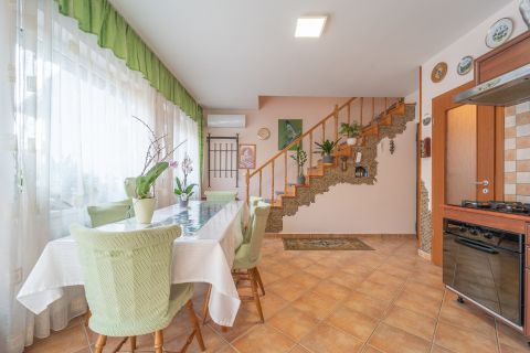 Az alsó szinten egy tágas konyha–étkező, amely kényelmes teret biztosít a mindennapi családi étkezésekhez és a vendégek fogadásához, valamint a nappali kapott helyet,