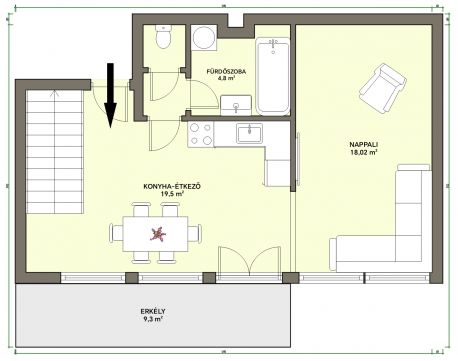 A nappaliból nyílik a 9,5 m²-es erkély, amely zöld kertre néz, így nyugodt, kellemes környezetet biztosít a pihenéshez vagy akár egy reggeli kávéhoz.