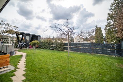 A nappalihoz kapcsolódó 13nm-es terasz kellemes helyszínt biztosít pihenéshez vagy a hozzá tartozó kertben családi, baráti összejövetelekhez. Az ingatlanhoz 515nm-s saját telekrész tartozik, melynek gondozásáról SAMU az automata fűnyíró gondoskodik. A kertben van még egy fedett rész, ahol amely akár még egy autó beállására vagy nyári konyha kialakítására ad lehetőséget.