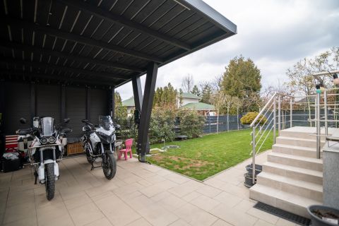 A hozzá tartozó garázs és a mögötte lévő fedett beállóhely 2 gépkocsi beállására alkalmas, elektromos autó töltési lehetőséggel.