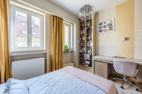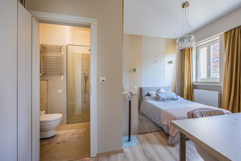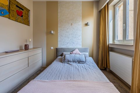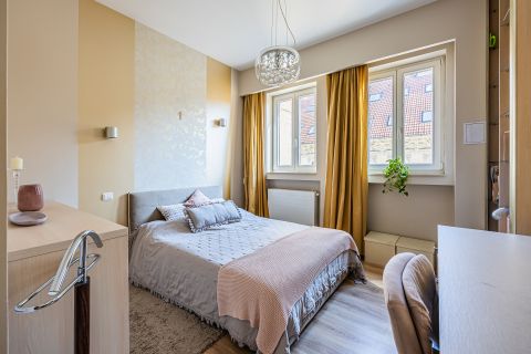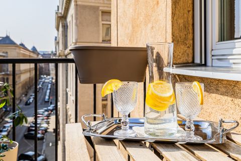 A lakás különlegessége a hangulatos erkély, ahonnan egy kellemes italt kortyolgatva élvezhetjük a belváros nyüzsgését.