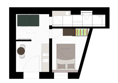 * Gangról nyíló bejárat, nincs közös folyosóhasználat, viszont van egy mindenki által használható kiülős közösségi rész műfűvel és asztalokkal