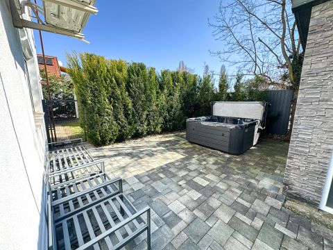 Az ingatlan állapota kiváló, enteriőrje modern, letisztult, könnyen kiadható és vendégbarát. A szobák külön nyílnak, így a férőhelyek jól szervezhetők, a nappali és a konyha-étkező praktikus, a kültéri részek pedig komoly pluszértéket jelentenek. A 14 m²-es emeleti erkély, a fedett földszinti terasz, a gondozott kert és a hátsó udvarban kialakított 4 személyes jacuzzi kifejezetten vonzóvá teszik a vendégek számára.