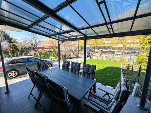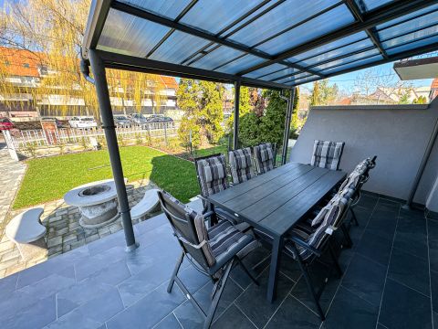 A kertben található továbbá kültéri étkezőrész, bográcsozó, napozóágyak, valamint a kényelmet szolgáló automata öntözőrendszer, riasztó és kamerarendszer is. A parkolás szintén erős szempont a kiadásnál: 3 zárt udvari beállóhely, plusz 1 további hely a kapu előtt áll rendelkezésre.