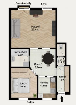 Világos, napfényes nappali franciaerkéllyel, amely tágas térérzet biztosít a duplaszárnyas üvegajtóknak köszönhetően