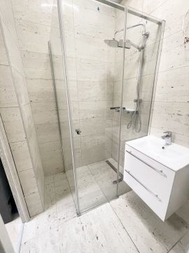 A fürdőszobában épített zuhanyzó lett kialakítva, a melegvizet új energiatakarékos Ariston bojler látja el.