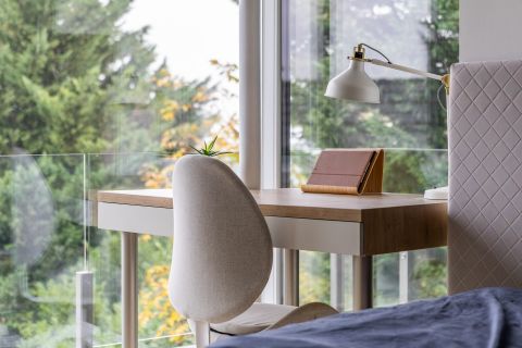 Tavasszal a kert ébredése az első fényekkel együtt indul: az ablakokon beáradó friss zöld illat a ház minden szintjét átjárja, a nappali teréből nézve a fák rügyezése lassan kibontott festménynek tűnik.