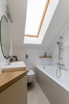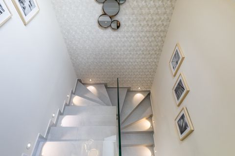 A fürdőszobák márványhatású burkolatai és lágy fényei az esti rituáléknak ad letisztult, kellemes, tiszta teret.