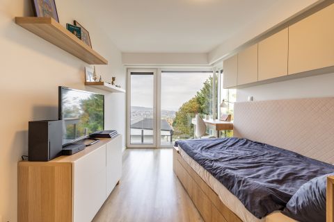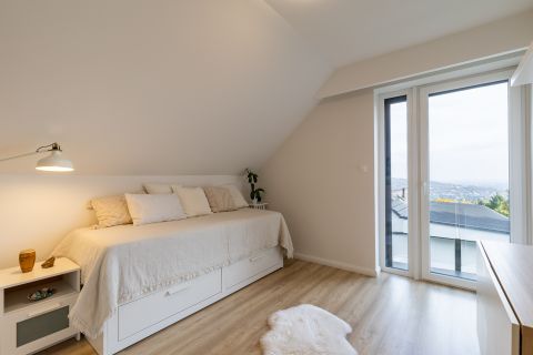 A felső szint csodás panorámával és erkélykapcsolattal kényezteti a család minden tagját, itt három külön bejáratú hálószoba és két fürdőszoba kapott helyet.