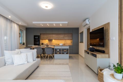 A nappali, az étkező és a konyha egyetlen áramló térben kapcsolódik össze — ott, ahol az illatok, a fények és a nevetések találkoznak.