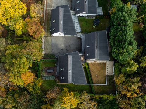 Ősszel az erdő közelsége új színt hoz: a domboldal aranyló levelei a homlokzatról visszaverődő fényekkel játszanak, a teraszról kilépve érezni a nedves föld és a lehulló levelek illatát – ez a ház ilyenkor különösen otthonos, bensőséges.
