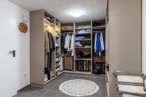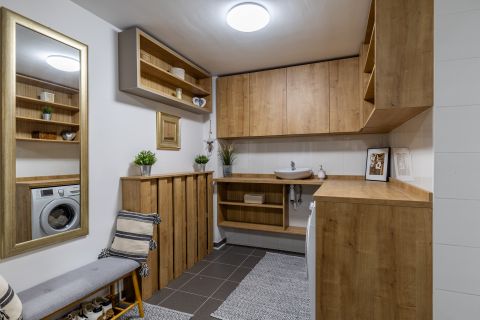 A padlófűtés és radiátor kombinációja télen finom, egyenletes meleget ad, a klíma pedig nyáron is hűvösen tartja a tereket. A gardrób és a háztartási helyiség csendben végzi a dolgát – támogatja a családot abban, hogy minden a helyén maradjon, miközben az élet zajlik körülötte.
