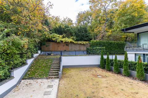 Az épület minden részletében az arány és a funkcionalitás találkozik: a garázs két autó számára kínál fedett helyet, a kert pedig teraszosan követi a domboldalt, így a ház minden szintjén megmarad a kapcsolat a zölddel és a kilátással.