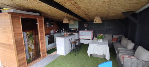 A fedett melléképületben komplett nyári konyha került beépítésre, ideális helye a családi, baráti összejöveteleknek.