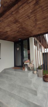 A teljesen körbekerített téglalap alakú telekre elektromos működtetésű kapun lehet behajtani, ahol 2 autónak van kialakítva fedett parkolóhely.