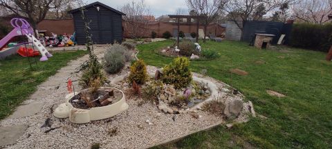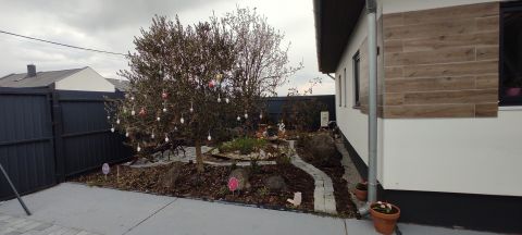 A parkosított telken gyerekparadicsom lett kialakítva játszótérrel és kerti tóval.