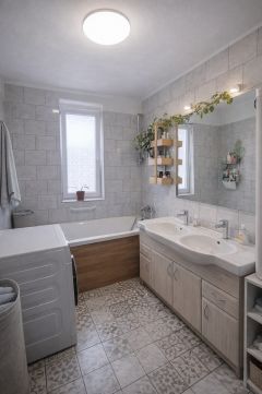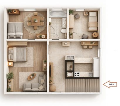 A praktikus elrendezés (nappali + 2 hálószoba, külön WC, tágas fürdő dupla mosdóval) kényelmes, jól élhető otthont biztosít.