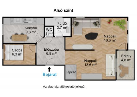 - Fsz: Nappali, 1. hálószoba, konyha-étkező, fürdőszoba, wc, előszoba, lépcsőház, erkély