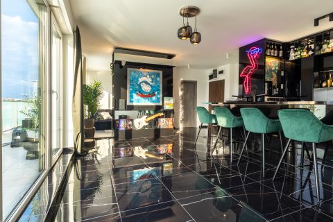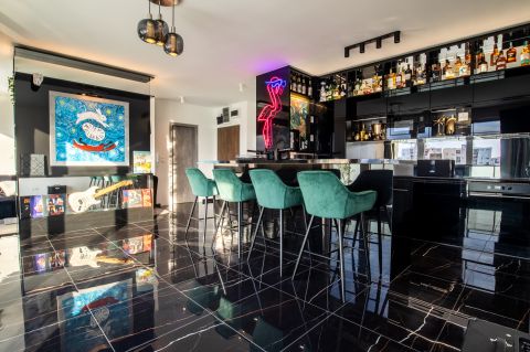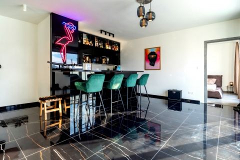 ✅ A szobák laminált padlóval, a fürdőszobák és a bárpultos nappali pedig magasfényű járólappal burkolták.