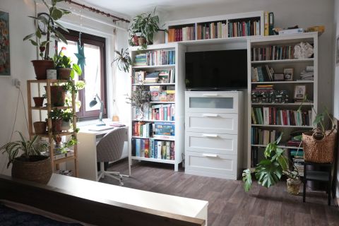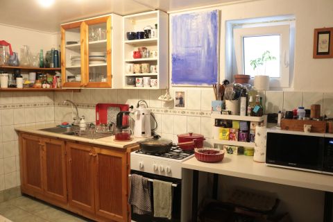 Jelenleg kb. 75 nm lakott: előszoba, nappali, hálószoba, konyha és étkező, spejz, fürdőszoba és külön WC.