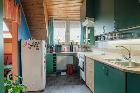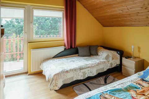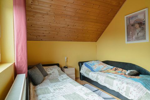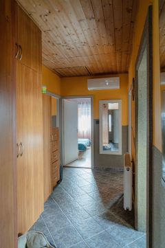 - emelet, mely külső lépcsővel közelíthető meg, és teljesen szeparált: 3 hálószoba (14.8, 12.9, és 14.6 nm) , nappali (20.4nm), konyha-étkező (6.7nm), fürdőszoba (3.2nm), közlekedő (9.3nm), szélfogó (2.5nm), erkély (13.3nm)