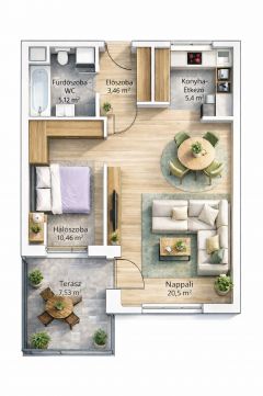 • 46 m² lakás + 7,5 m² részben fedett terasz