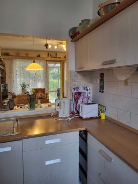- On the first floor, there is an entrance hall, living room + dining area, extremely practical with a kitchen connection through a serving window, and a bathroom with a toilet.