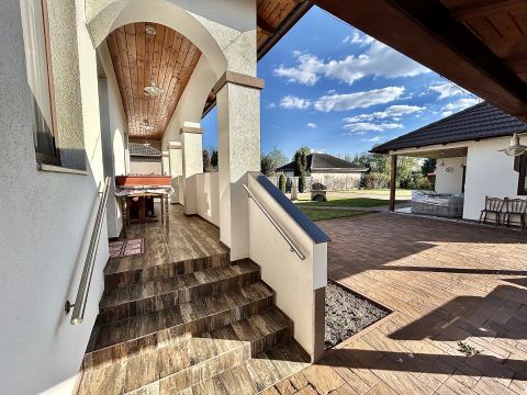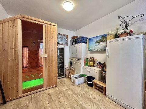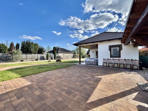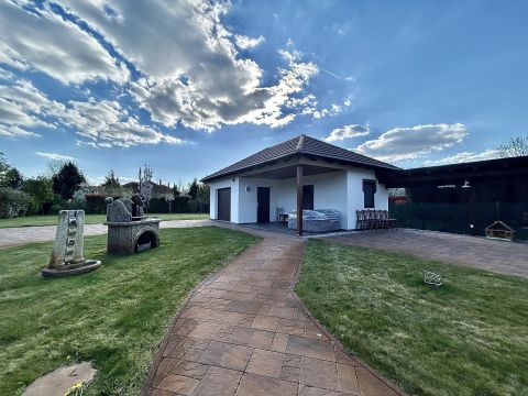 A kertben helyet kapott egy garázs, valamint egy hangulatos nyárikonyha is, ahol a hűvösebb napokon szauna gondoskodik a kikapcsolódásról és feltöltődésről.