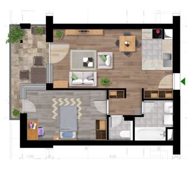 - Mindkét szobából kijárat nyílik a 9 nm-es műfüves teraszra, amely tökéletes hely a reggeli kávéhoz vagy egy kis pihenéshez.