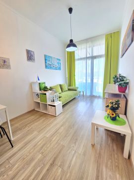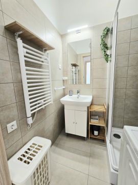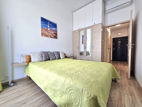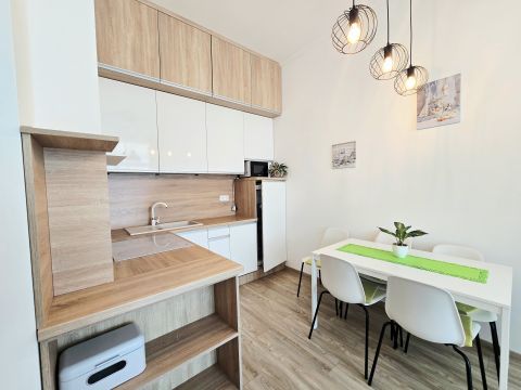 A lakás modern, letisztult stílusban berendezett, minőségi bútorokkal és teljesen gépesített konyhával.
