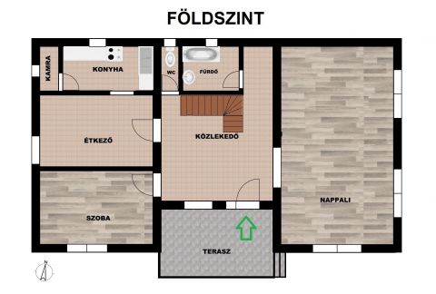 FÖLDSZINTJÉNnappali és egy szobámn kívül konyha, étkező, kamra, külön WC, fürdőszoba és egy déli fekvésű fedett terasz van kialakítva. 32m2-es nappaliból akár egy 12m2-es szoba egyszerűen leválasztható.