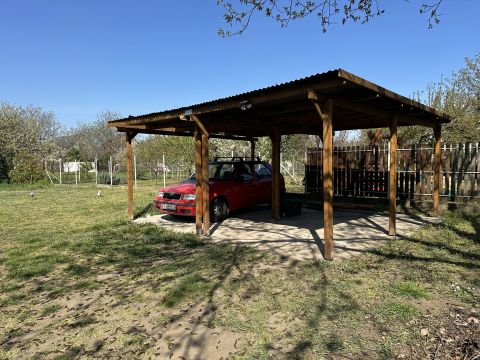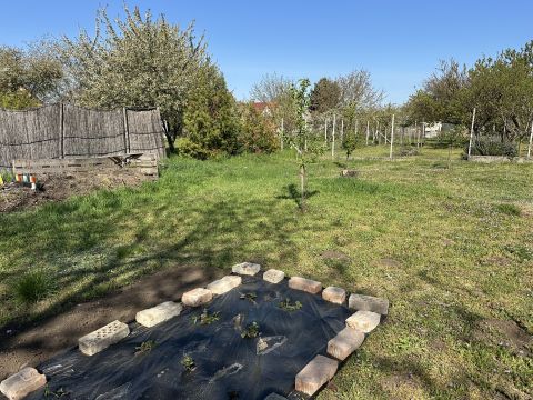 A tiszta, rendezett udvaron állattartásra alkalmas tégla építésű gazdasági épületek vannak, kertben gyümölcsfák lettek ültetve.