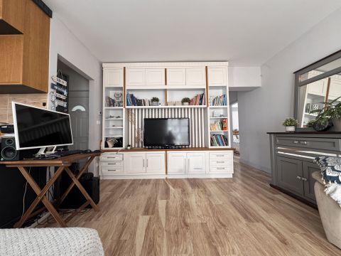 A tér kellemes, világos, a kialakítás ideális minden korosztály számára. A konyhabútor teljesen gépesítet, modern stílusú megjelenését otthonossá lágyítják a nappali pasztell színei. Az enteriőr hangulatát az igényesen összeválogatott burkolatok, és egyedileg ide készült fa designelemek adják.